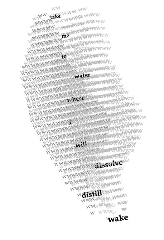 IMAGE DESCRIPTION: The image is formed with the repeated letter "w" in gray and peach. The gray and peach sections overlap, and the result is a shape like a human torso. Black text forms a line down the center and near the overlap. This text says "take / me / to / water / where / i / will / dissolve / distill / wake."