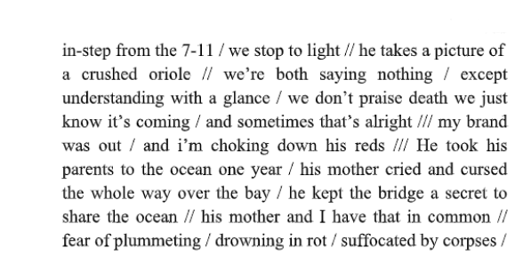 IMAGE DESCRIPTION: The poem is full-justified text reading thusly: “in-step from the 7-11 / we stop to light // he takes a picture of a crushed oriole // we’re both saying nothing / except understanding a with a glance / we don’t praise death we just know it’s coming / and sometimes that’s alright /// my brand was out / and i’m choking down his reds /// He took his parents to the ocean one year / his mother cried and cursed the whole way over the bay / he kept the bridge a secret to share the ocean /// he and I have that in common // fear of plummeting / drowning in rot / suffocated by corpses /”