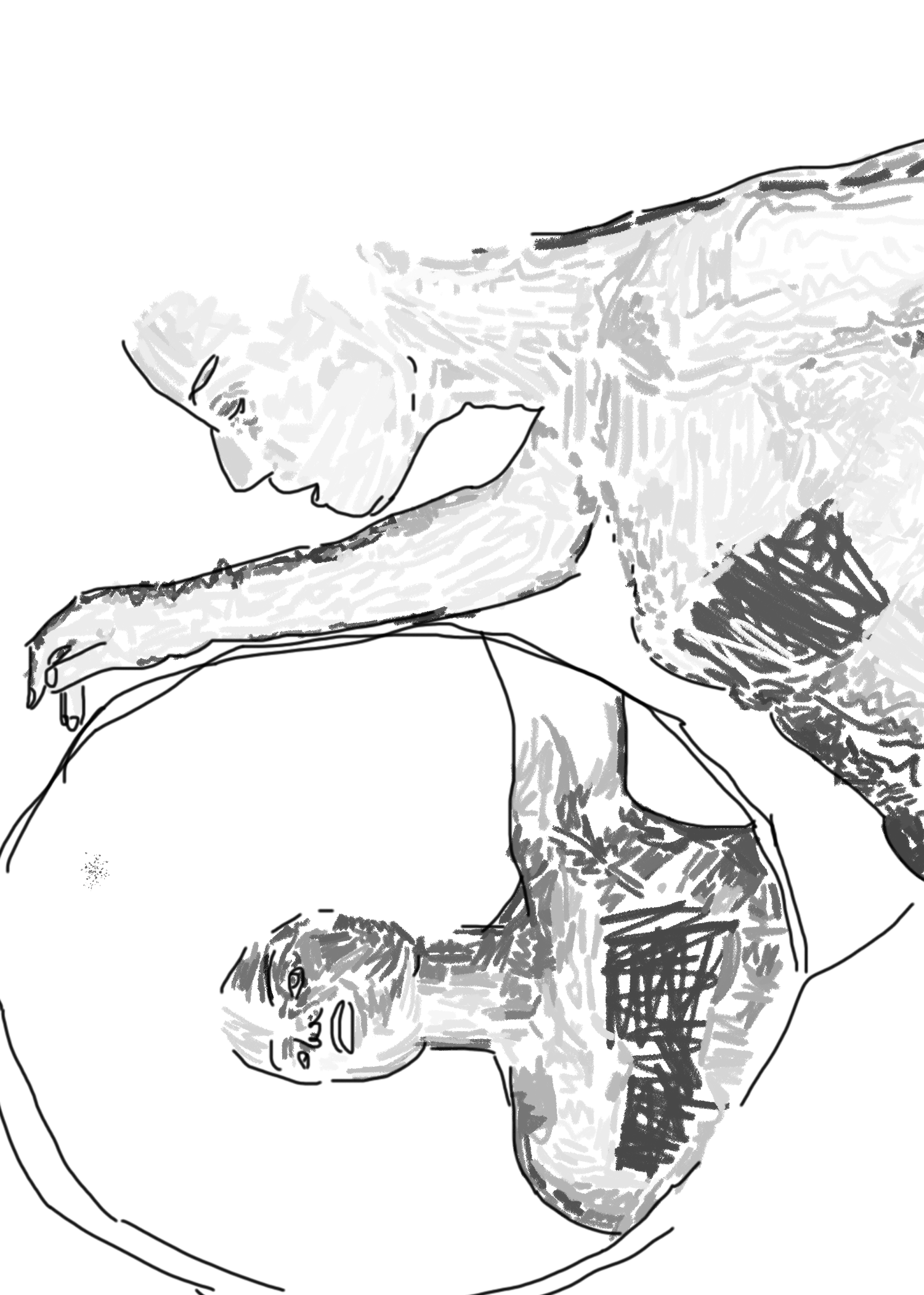 IMAGE DESCRIPTION: An illustration of a woman with an open mouth leaning over and looking at her reflection in a mirror. She is composed of short perpendicular lines that are white, gray, and black. The image reflected back at her has a firm facial expression with serious eyes and a closed mouth.